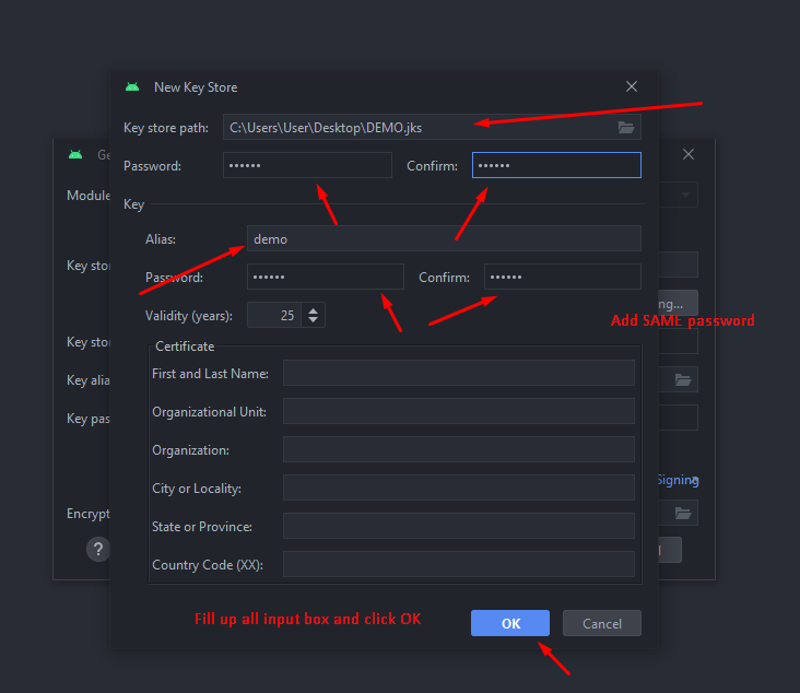 To generate a keystore in Android Studio, follow these steps: